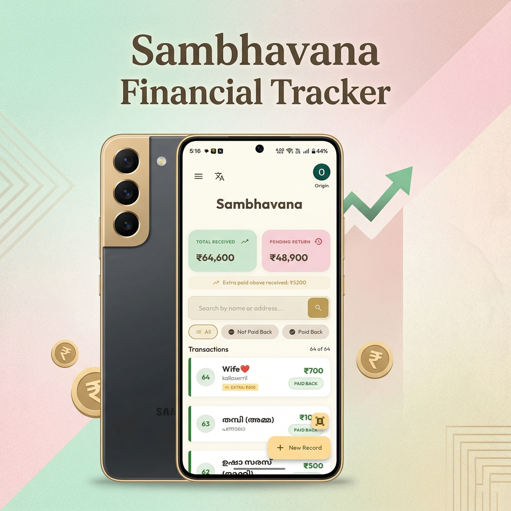 Sambhavana (meaning "contribution" or "offering") is built to ensure that your financial records are safe, searchable, and always accessible. Whether it’s a wedding, a housewarming, or a social event, Sambhavana helps you organize every detail with ease.
